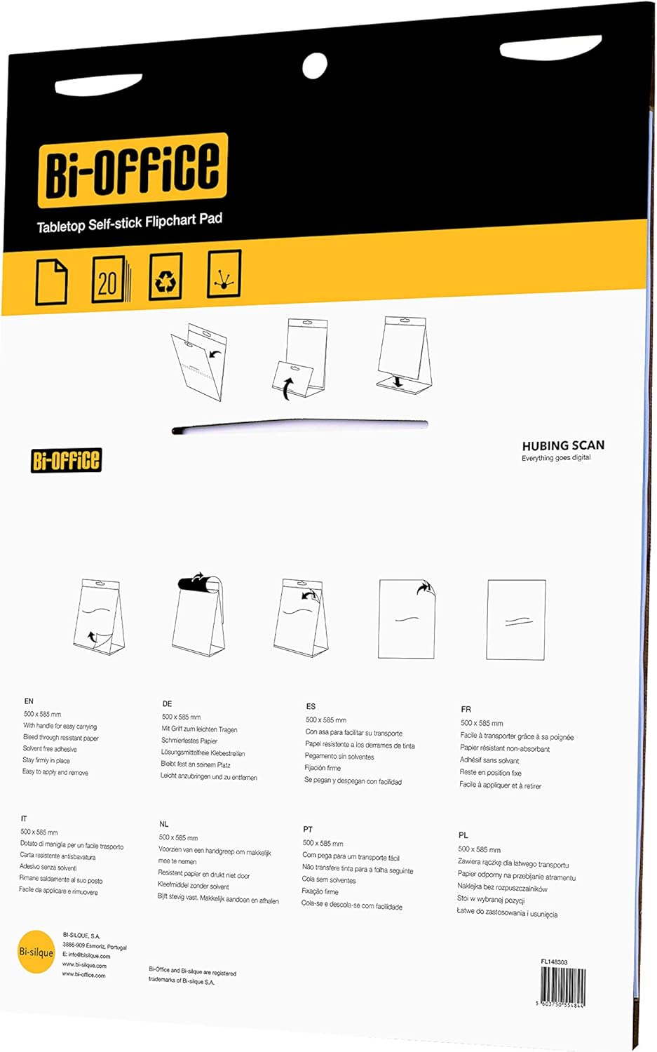 bi office tabletop self stick flipchart pad, 20 sheets 70 gr/m² paper, 58,5 x 50 cm, white