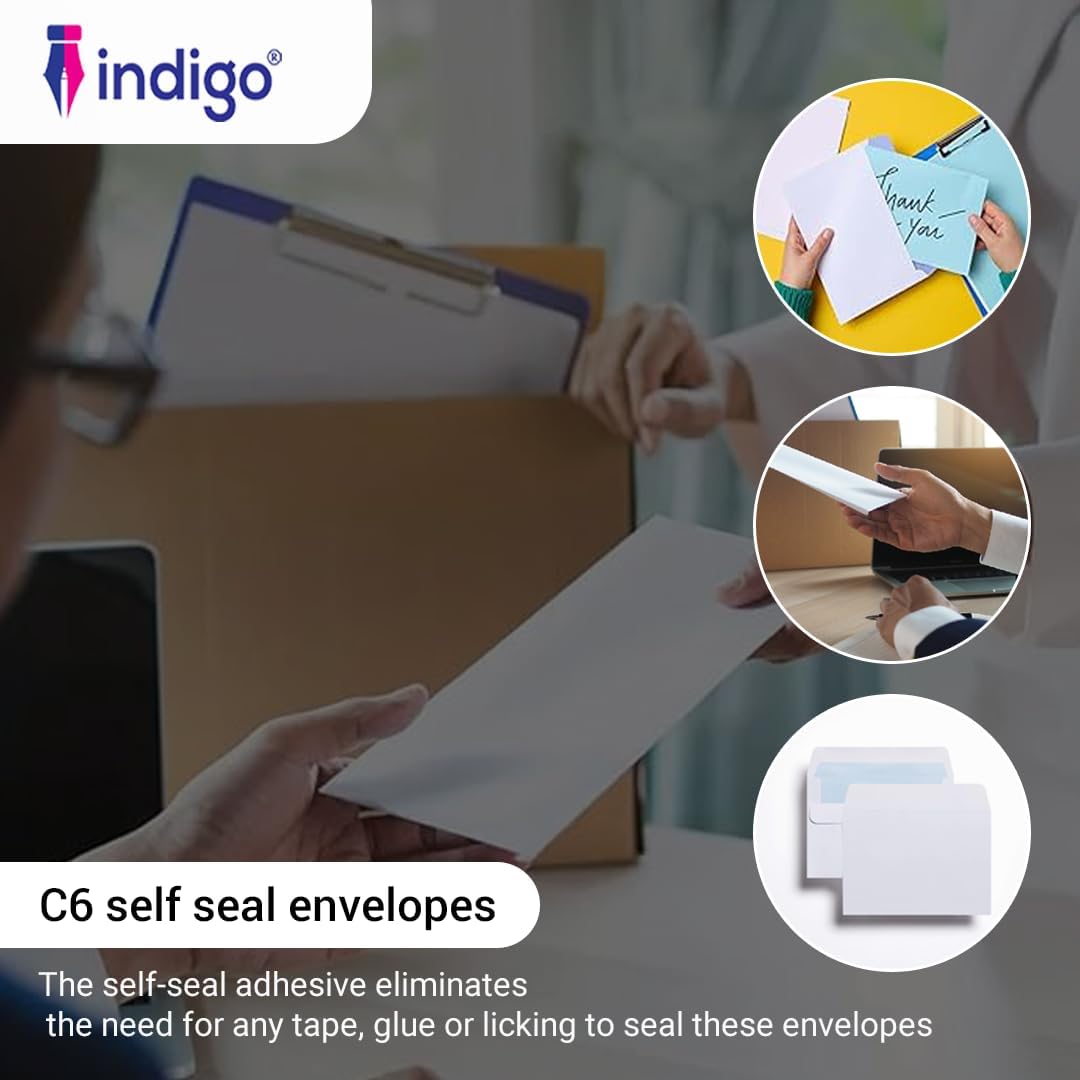 Keep your correspondence secure and professional with the Indigo® C6 White Self-Seal Envelopes, perfect for everyday mailing, invitations, greeting cards, and business letters. Made from premium white paper, these envelopes offer a clean and smart finish suitable for both personal and office use.