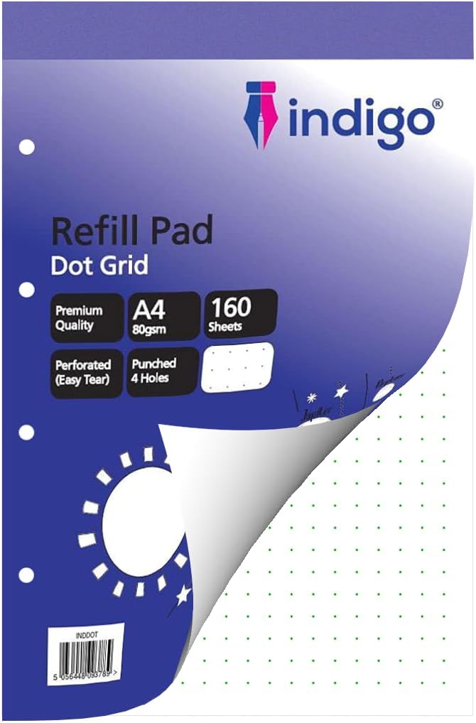 Designed for durability and everyday use, the Indigo® Dot Grid Refill Pad uses high-quality paper that minimises ink bleed-through, making it suitable for pens, highlighters, and markers. Whether for classroom notes, bullet journals, diagrams, or design layouts, this refill pad provides a smart, versatile surface to capture your ideas.