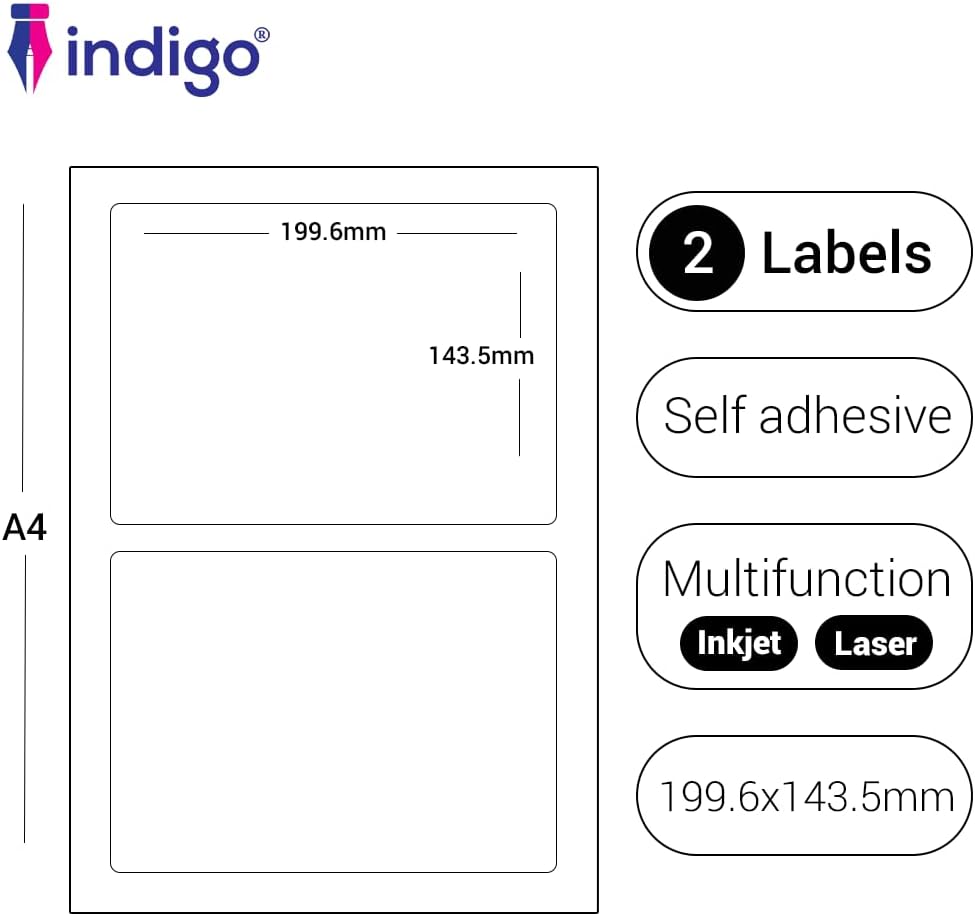Organise, label, and ship with confidence using Indigo® A4 White Sticker Labels. Each sheet contains 2 precisely cut labels (38.1 x 21.2mm), designed for smooth, professional printing with all Inkjet and Laser printers. Made from durable, waterproof adhesive material, these labels resist smudging, tearing, and peeling, ensuring your packages, files, and products look sharp and stay secure.
