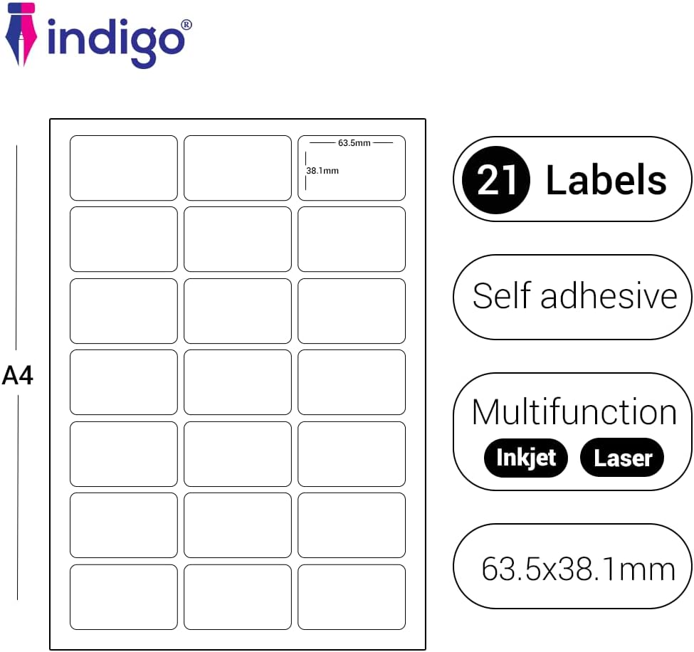 Organise, label, and ship with confidence using Indigo® A4 White Sticker Labels. Each sheet contains 21 precisely cut labels (38.1 x 21.2mm), designed for smooth, professional printing with all Inkjet and Laser printers. Made from durable, waterproof adhesive material, these labels resist smudging, tearing, and peeling, ensuring your packages, files, and products look sharp and stay secure.