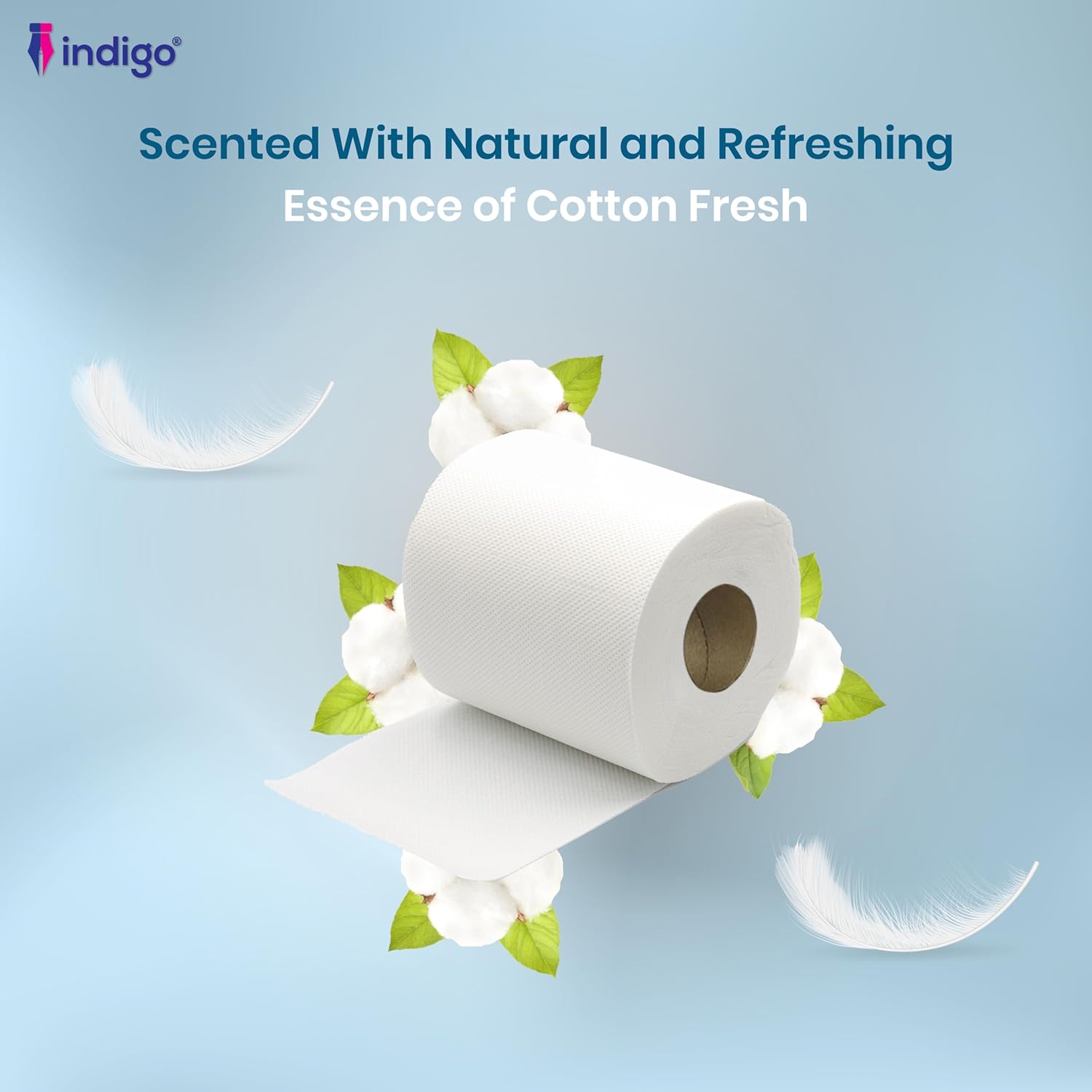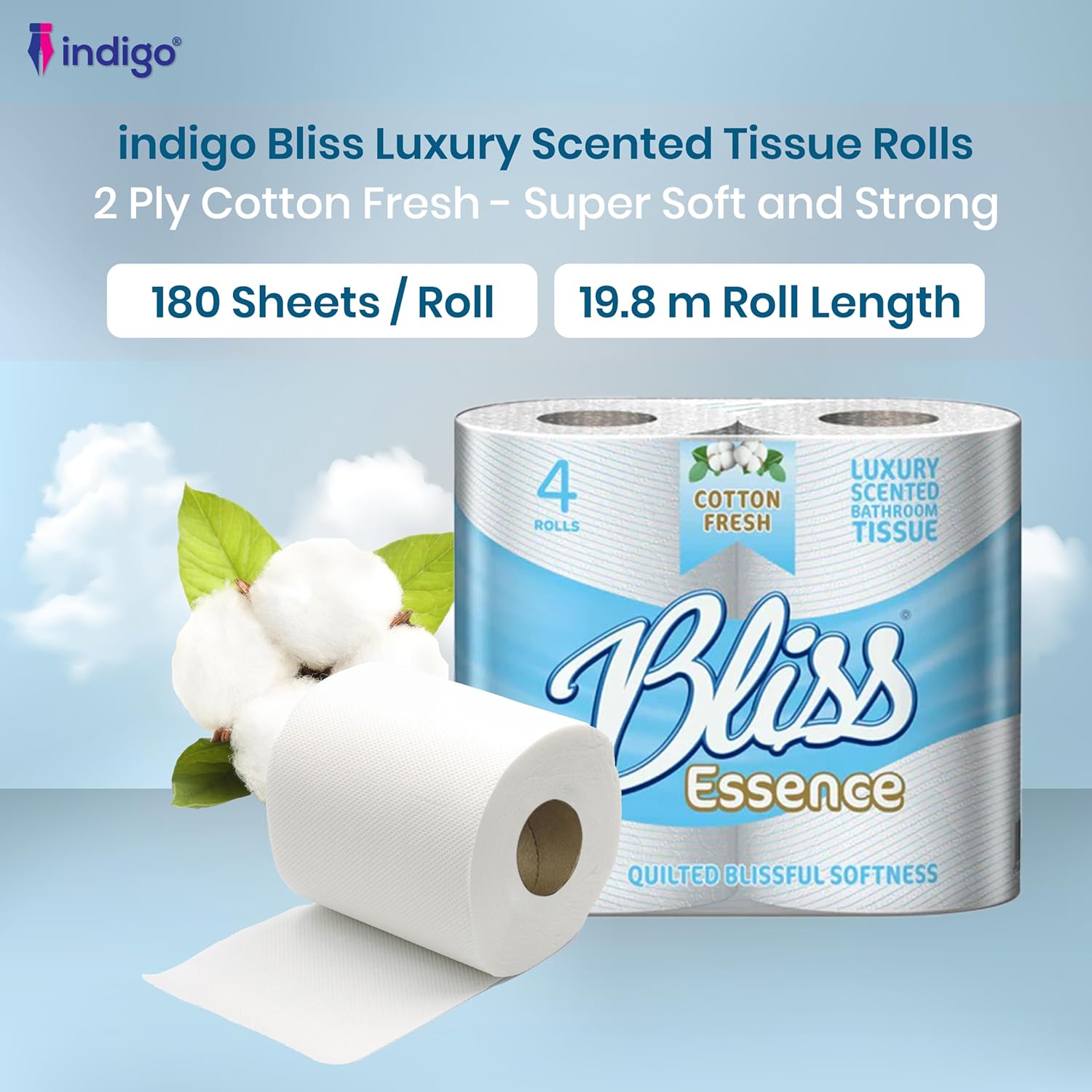 Bring comfort and freshness to your bathroom with Indigo® Bliss Cotton Fresh Luxury Scented Toilet Rolls. Infused with a subtle cotton fresh fragrance, these premium 2-ply quilted tissues combine softness and strength for an indulgent bathroom experience. The quilted design enhances comfort while delivering reliable durability for everyday use.